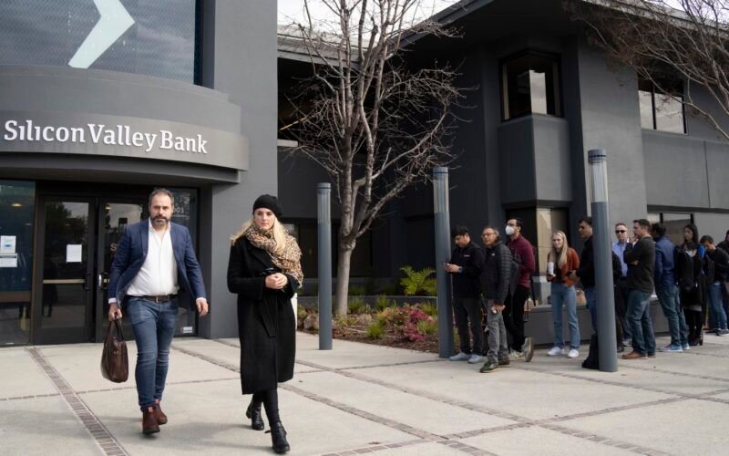 People line up outside the shuttered headquarters of Silicon Valley Bank (SVB) on March 10, 2023 in Santa Clara, California.