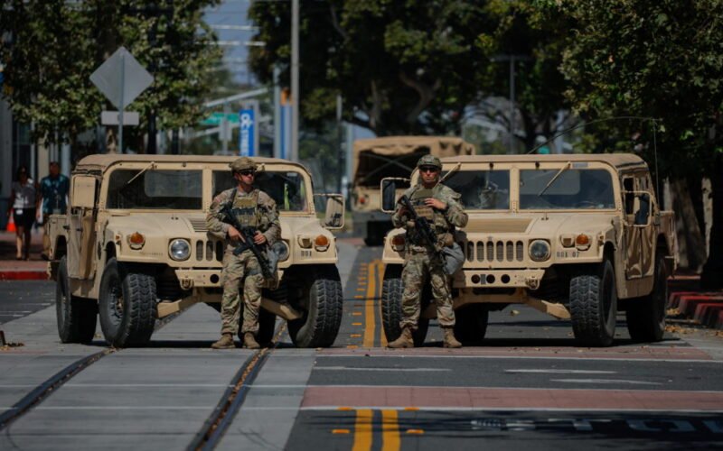 Trump took command of the California National Guard after protests against his tightening immigration enforcement. The recall was the first time in decades that a state’s National Guard had been activated without a request from its governor, and represented a major escalation in the administration’s efforts to implement a policy of mass deportations. Troops were stationed outside a federal detention center in downtown Los Angeles where protesters gathered and were later sent into the streets to protect immigration officers as they made arrests.
