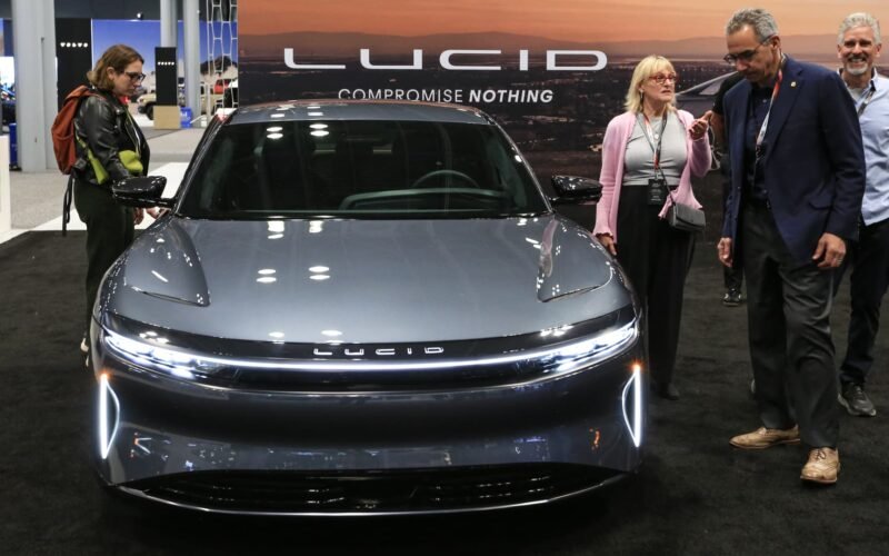 The Lucid display is shown at the New York International Auto Show on April 16, 2025.