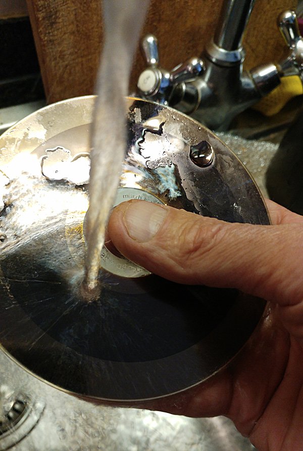 This is only one of the positions I placed them in and I alternated their faces so sometimes the data side was facing out sunwards and sometimes not. I half buried them for 2 months in soil as well for good measure. Here’s how they looked today when I retrieved them. The one on the left is the ordinary Blueray. It is completely destroyed. The sunlight has generated temperatures greater than the silver data layer to withstand, causing it to crack, expand and break off the substrate. The one on the right is the M-Disc. Apart from a soiled surface, it otherwise looks intact.