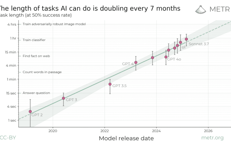 Summary: We propose measuring AI performance in terms of the length of tasks AI agents can complete. We show that this metric has been consistently exponentially increasing over the past 6 years, with a doubling time of around 7 months. Extrapolating this trend predicts that, in under a decade, we will see AI agents that can independently complete a large fraction of software tasks that currently take humans days or weeks.