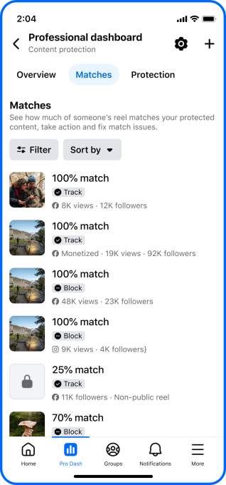 For the tool to work, it uses the same matching technology that Meta Rights Manager currently uses for copyright holders. It will also show the match percentage for each match that appears, as well as other details, such as views, number of followers, and monetization status.