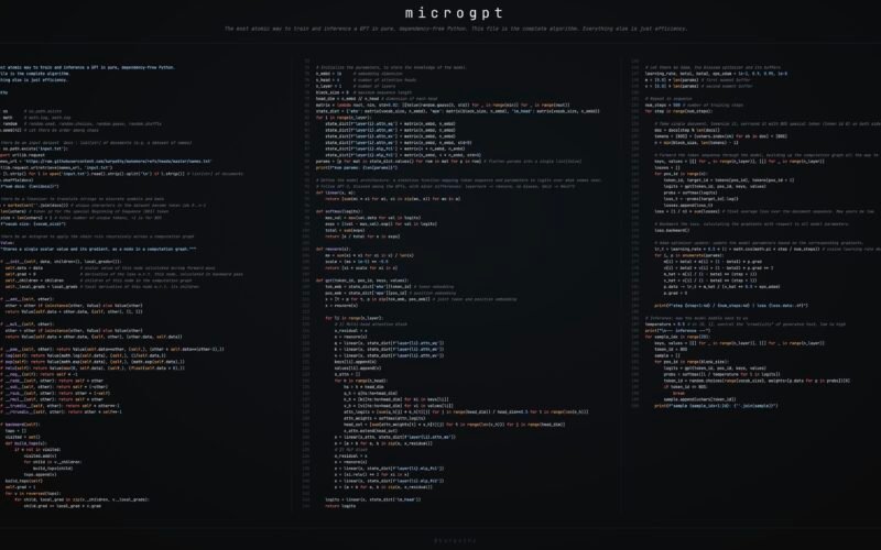 This is a brief guide to my new art project microgpt, a single file of 200 lines of pure Python with no dependencies that trains and inferences a GPT. This file contains the full algorithmic content of what is needed: dataset of documents, tokenizer, autograd engine, a GPT-2-like neural network architecture, the Adam optimizer, training loop, and inference loop. Everything else is just efficiency. I cannot simplify this any further. This script is the culmination of multiple projects (micrograd, makemore, nanogpt, etc.) and a decade-long obsession to simplify LLMs to their bare essentials, and I think it is beautiful 🥹. It even breaks perfectly across 3 columns: