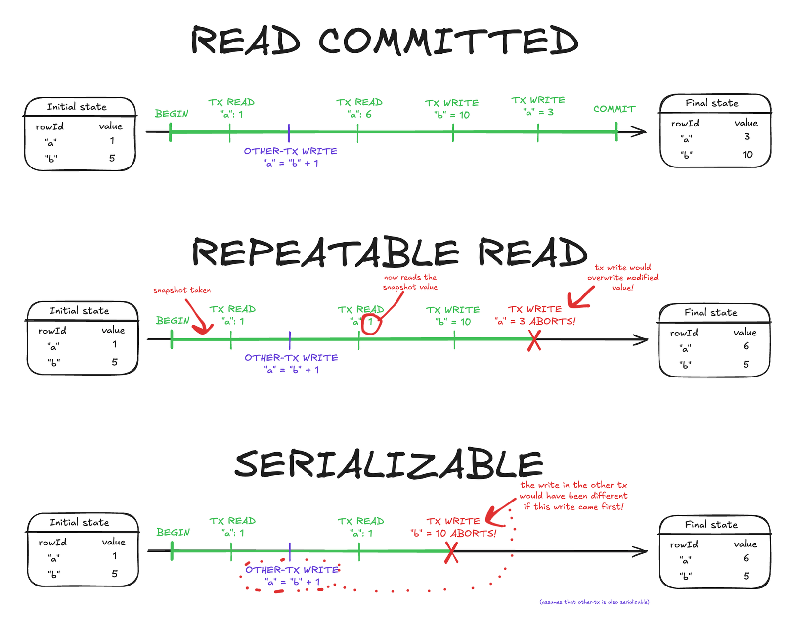 - SERIALIZABLE: Like REPEATABLE READ, but write statements abort the transaction if any dependent rows changed since the snapshot.