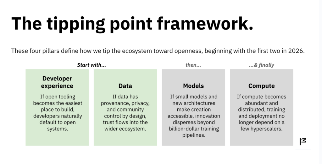 The first is developer experience. Developers are the ones who actually build the future — every default they set, every stack they choose, every dependency they adopt shapes what becomes normal for everyone else. Right now, the fastest path runs through closed APIs, and that’s where most of the building is happening. But developers don’t want to be locked in any more than users do. Give them open tools that work as well as the closed ones, and they’ll build the open ecosystem themselves.