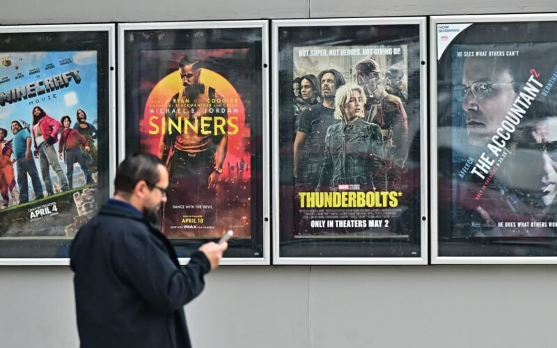 A man walks past movie posters at the AMC Theater in Montebello, California on May 5, 2025.
