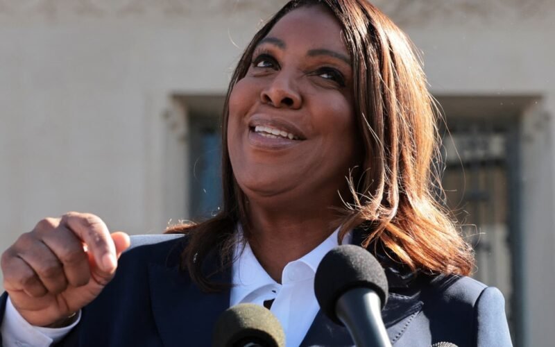 New York Attorney General Letitia James speaks to the media, after she attended a hearing and pleaded not guilty to charges that she defrauded her mortgage lender, outside the US District Court for the Eastern District of Virginia, in Norfolk, Virginia, US, October 24, 2025.