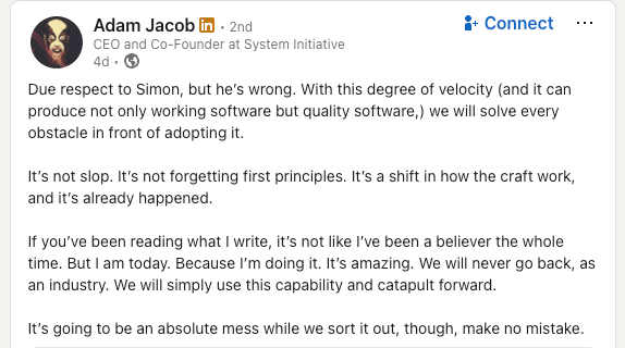 Jacob is right that AI is changing the way that normal software development work gets done. It’s a new capability that has proven itself to be so useful that it clearly isn’t going away. Yes, it represents a significant shift in how we build software, it moves us further away from how the underlying stuff actually works, but the benefits exceed the risks.
