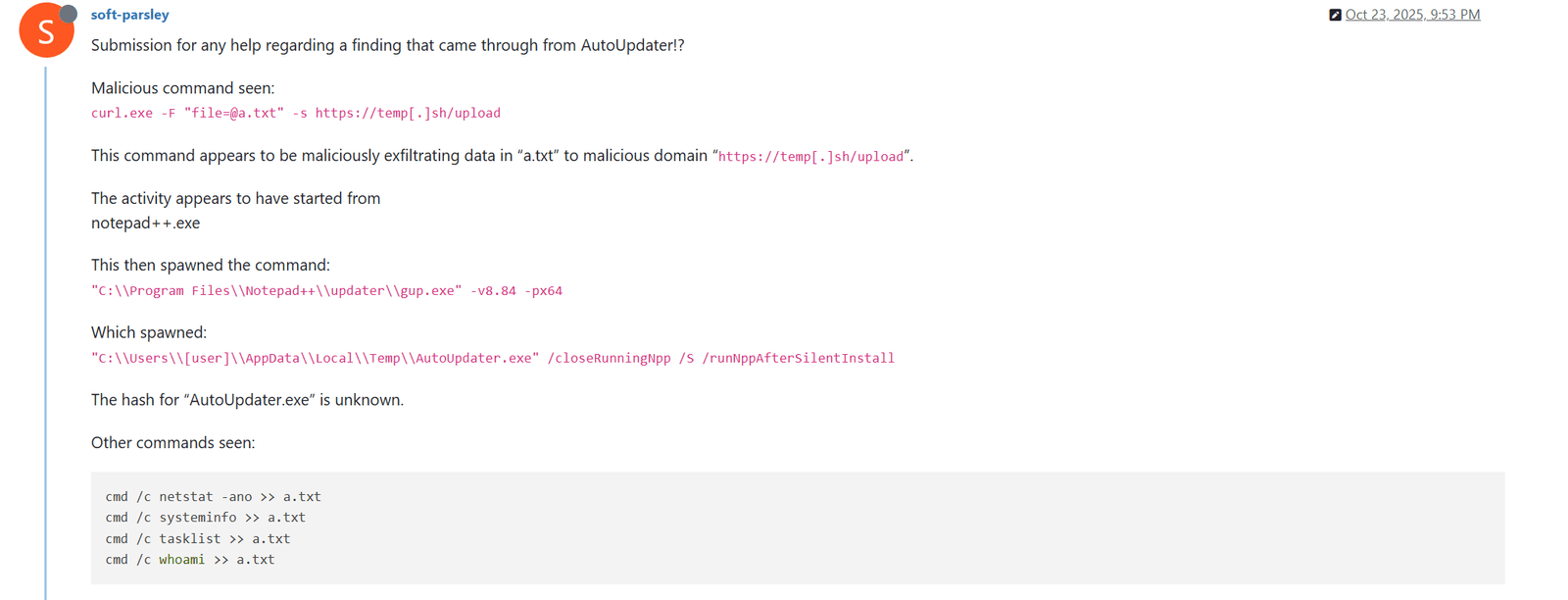 Notably, the same behavior of malicious Notepad++ updates, specifically the launch of shell commands and the use of the temp[.]sh website for file uploading, has been described on the Notepad++ community forums by a user named soft-parsley.