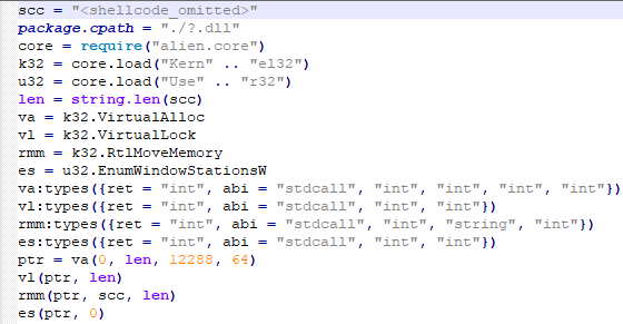 As we can see, this small script is used for placing shellcode inside executable memory and then launching it through the EnumWindowStationsW API function.
