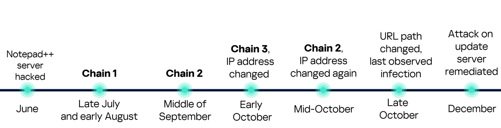 Notepad++ is a text editor used by numerous developers. As such, the ability to control update servers of this software gave attackers a unique possibility to break into machines of high-profile organizations around the world. The attackers made an effort to avoid losing access to this infection vector — they were spreading the malicious implants in a targeted manner, and they were skilled enough to drastically change the infection chains about once a month. Whilst we identified three distinct infection chains during our investigation, we would not be surprised to see more of them in use. To sum up our findings, here is the overall timeline of the infection chains that we identified:
