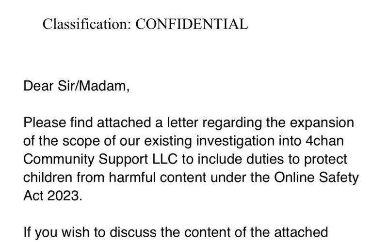 4chan is a website where users are free to remain anonymous. Your “age assurance” rules would destroy anonymity online, which is protected by the First Amendment. Accordingly, 4chan will not be implementing your “age assurance” rules.