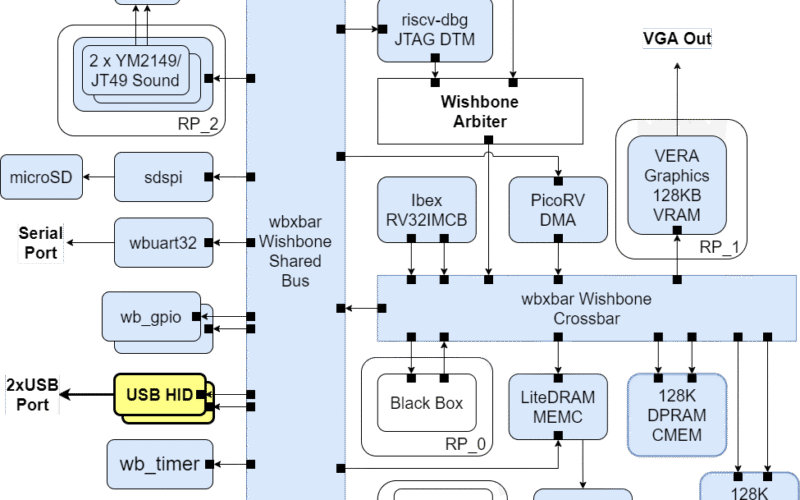 • VERA-based VGA graphics: 2 layers tile or bitmap mode, 2 banks of 64 sprites, 128KB Video RAM, 256 color palette.