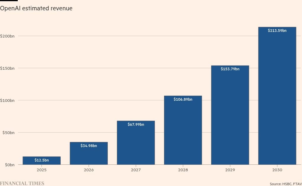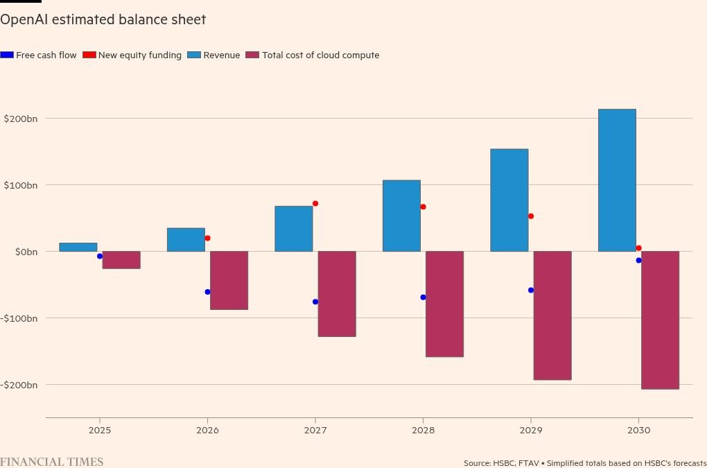 OpenAI’s cumulative free cash flow to 2030 may be about $282bn, it forecasts, while Nvidia’s promised cash injections and the disposal of AMD shares can bring in another $26bn. The broker also includes OpenAI’s $24bn of undrawn debt and equity facilities and, at the 2025 mid-year point, its $17.5bn of available liquidity.