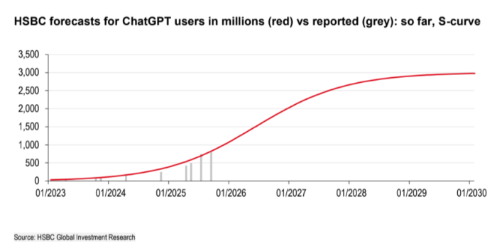 LLM subscriptions will become “as ubiquitous and useful as Microsoft 365”, HSBC says. It models that by 2030, 10 per cent of OpenAI users will be paying customers, versus an estimated 5 per cent currently.