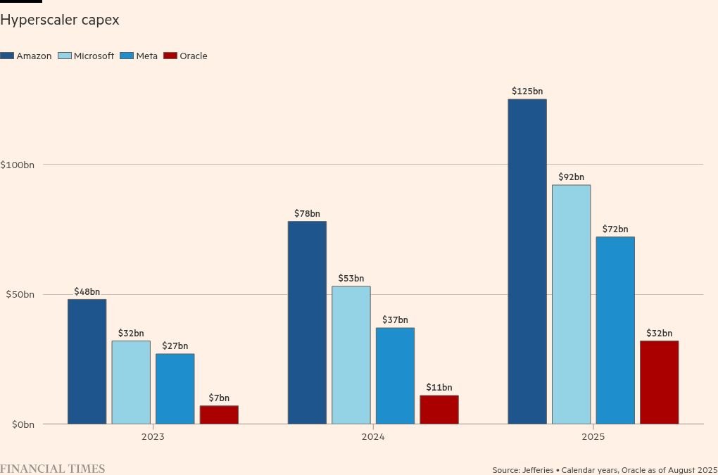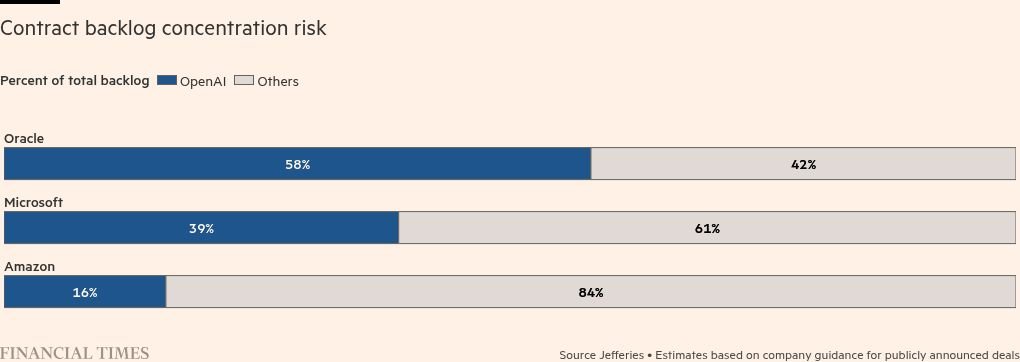 Investor unease stems from Big Red betting a debt-financed data farm on OpenAI, as MainFT reported last week. We’ve nothing much to add to that report other than the below charts showing how much Oracle has, in effect, become OpenAI’s US public market proxy: