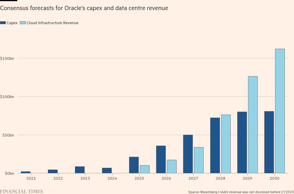 To get there, Oracle’s capex budget for the current financial year ending May is $35bn. The consensus has annual capex levelling out at around $80bn a year in 2029, after which revenues continue to ramp: