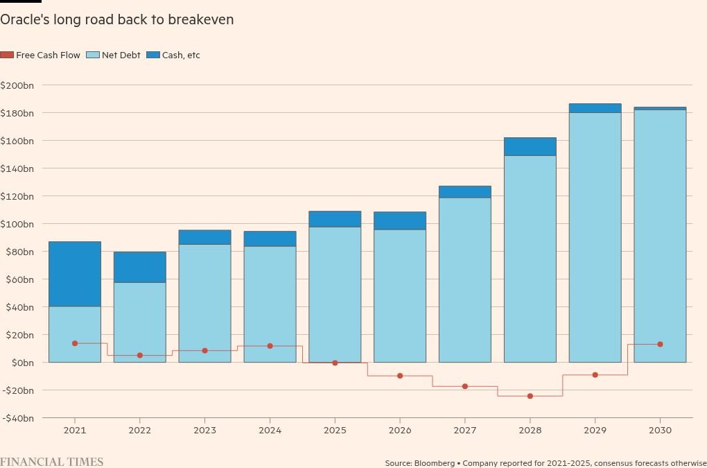 But Oracle’s net debt is already at 2.5 times ebitda, having more than doubled since 2021, and it’s expected to nearly double again by 2030. Cash flow is forecast to remain negative for five straight years: