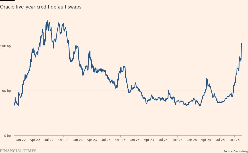 So while the OpenAI agreement has been more than written off the equity, the risk of unfunded expansion remains and the cost of hedging Oracle debt is at a three-year high.