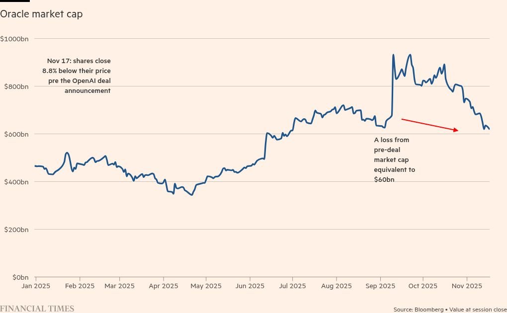 Since September 10, when Oracle announced a $300bn deal with the chatbot maker, its stock has shed $315bn* in market value: