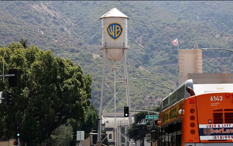 A bus passes near the Warner Bros. studio on September 12, 2025 in Burbank, California.