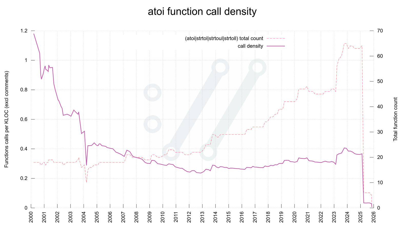 As of yesterday, November 12 2025 all of those weak functions calls have been wiped out from the curl source code. The drop seen in early 2025 was when we got rid of all strtrol() variations. Yesterday we finally got rid of the last atoi() calls.