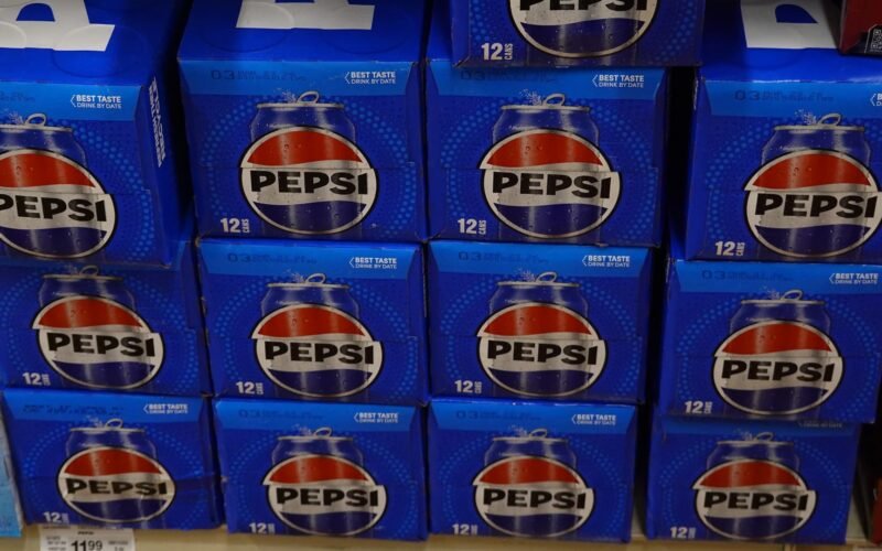 Pepsi cans are displayed on a store shelf on October 9, 2025 in San Anselmo, California.