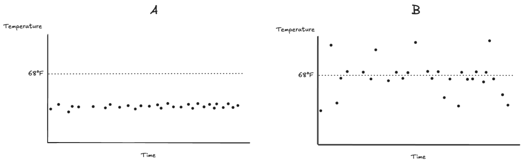 Note how the points for thermostat A all fall within a narrow band, whereas for thermostat B there are many more outliers. We’d say that thermostat A is under statistical process control whether thermostat B is not, even though the average temperature for thermostat B is closer to the setpoint then the average temperature for thermostat A. (In practice, you’d draw a control chart to identify whether the system is under statistical control).