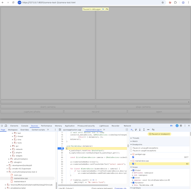 The easiest way to debug Qt Webassembly is by configuring using the -g argument, or CMAKE_BUILD_TYPE=Debug . Emscripten embeds DWARF symbols in the wasm binaries.