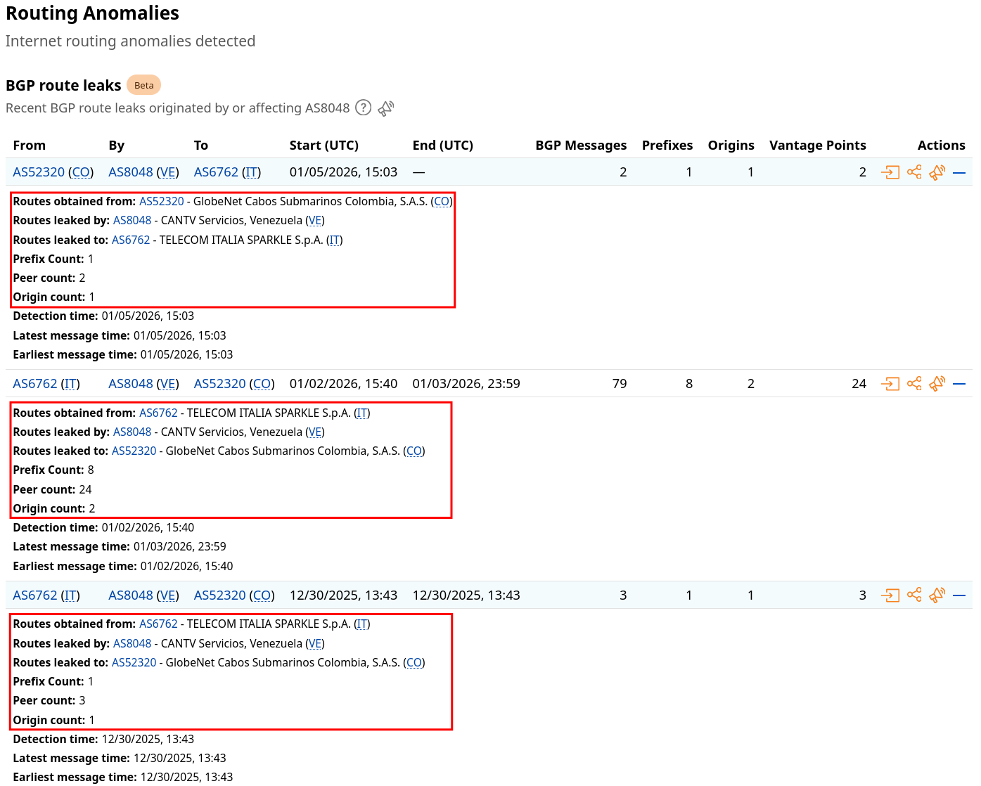 Cloudflare Radar’s route leak data for AS8048 on January 2nd had some interesting anomalies: 8 prefixes (blocks of IP addresses) were being routed through CANTV, with Sparkle (an Italian transit provider) and GlobeNet (a Colombian carrier) in the Autonomous System (AS) path. The AS path is essentially the list of networks traffic passes through to reach its destination. CANTV was in a path it is not typically a part of.