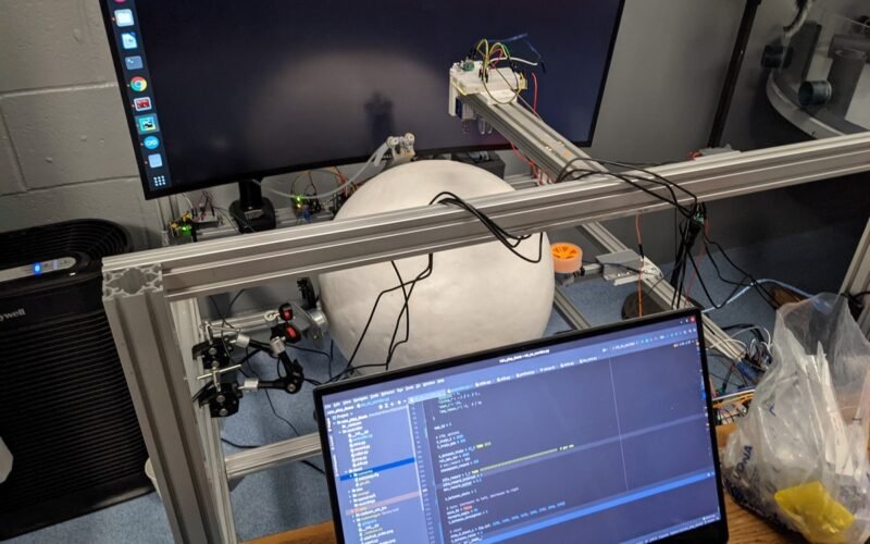 The hardware is a comprehensive VR rig designed for rodents. It consists of a motion-tracked sphere that captures the rat’s movements, a custom-built trigger for in-game actions, a curved panoramic screen for visual immersion, and an automated reward system that dispenses sugar water to reinforce behavior. All these components are mounted on a modular aluminum frame, creating a complete, self-contained environment for the rat to interact with the game.
