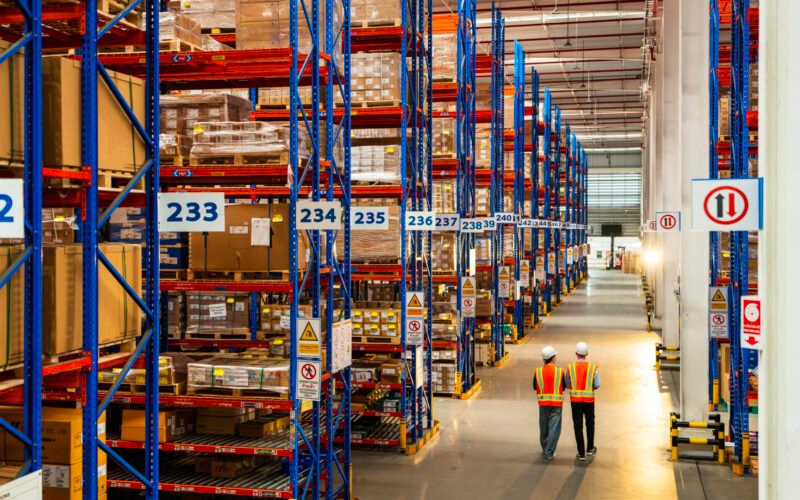 A large industrial warehouse has rows of shelves stacked with packages, as two workers wearing safety gear walk by and inspect the warehouse. The space utilized represents efficiency and systematic inventory management.