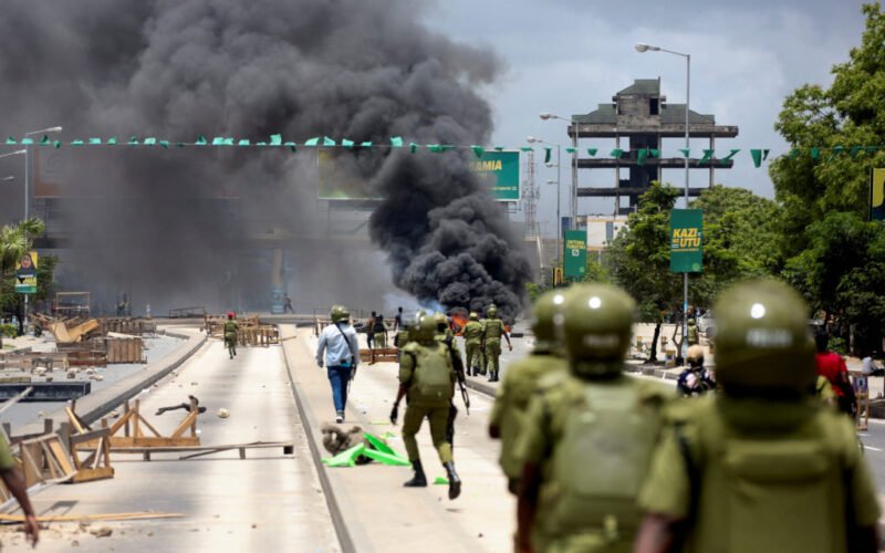 Tanzanian riot police officers walk past a vandalized campaign poster of President Samia Suluhu Hassan, following a protest a day after a general election marred by violent demonstrations over the exclusion of two prominent opposition candidates. Photography by Thomas Mukoya/Reuters