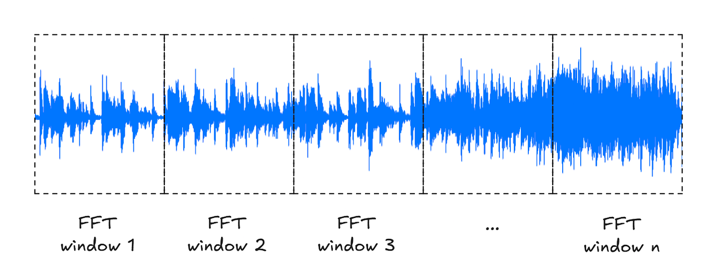 Instead, we need to chop up the track into small slices, typically somewhere around 20-100 ms. This is long enough for each slice to contain a reasonable number of samples, but short enough to more or less represent a momentary “steady state” of the underlying waveform.