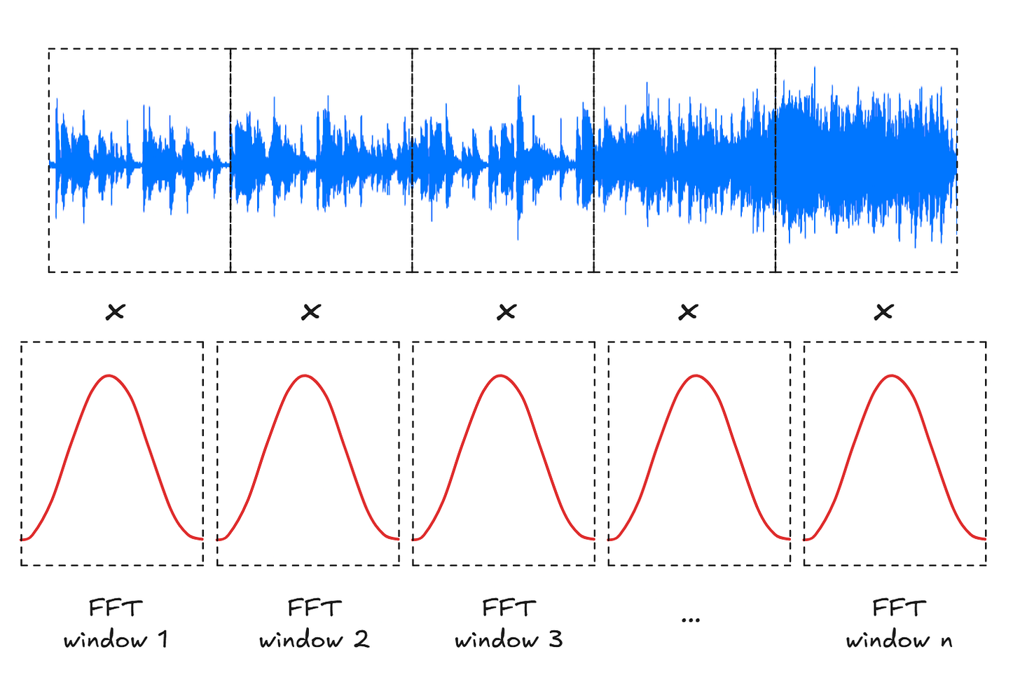 The trick is to also calculate another sequence of “halfway” FFT windows of the same size that overlap the existing ones (second row below):