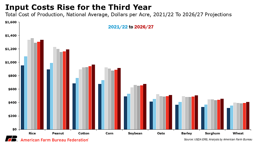 - Per-acre production costs for all nine principal row crops are projected to rise again in 2026, continuing a troubling trend that began after 2021.