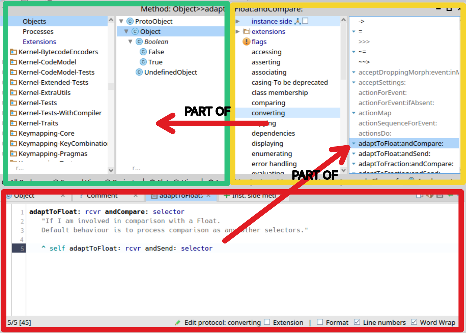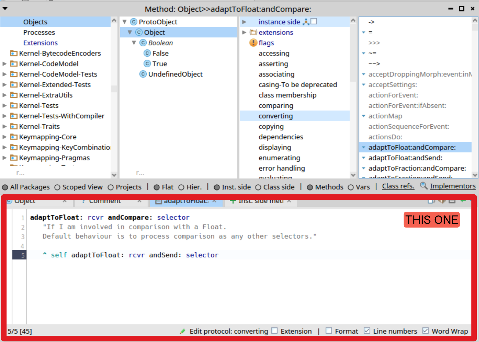 Because programming in Smalltalk is about message passing, it’s tempting to treat the code pane—the method editor—as the “main” component: