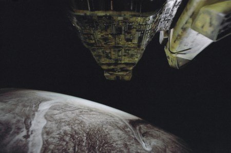 “I didn’t want a conventional shape [for the refinery,] so I drew up a sketch and handed it to the model makers. They refined it, as it were, and built the model. I originally drew it upside-down, with the vague idea that it would resemble a floating inverted cathedral … I think that the machine that they’re on could in fact be 60 years old and just added to over the decades. The metal-work on it could be 50 years old … I would have liked to see it covered with space barnacles or space seaweed, all clogged and choked up, but that was illogical as well.”