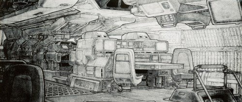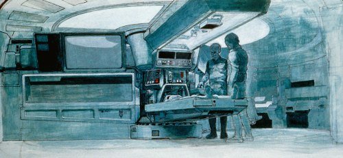 Cobb’s sketches, drawings and paintings for the interiors were also okay’ed by Scott and the production. At first Cobb’s designs were slightly more fantastical, with giant screens and computer readouts and windows covered by protective shells that would open up to reveal alien planets ahead of the ship. Though these ideas were scuppered due to time, money, and logistics, many of Cobb’s early designs and ideas were revisited in Prometheus.
