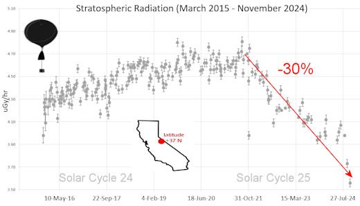 Data points in the graph labeled “Stratospheric Radiation” correspond to the peak of the Regener-Pfotzer maximum, which lies about 67,000 feet above central California. When cosmic rays crash into Earth’s atmosphere, they produce a spray of secondary particles that is most intense at the entrance to the stratosphere. Physicists Eric Regener and Georg Pfotzer discovered the maximum using balloons in the 1930s and it is what we are measuring today.