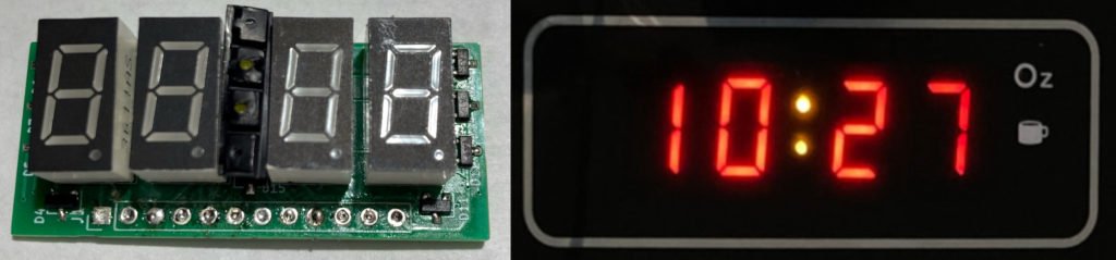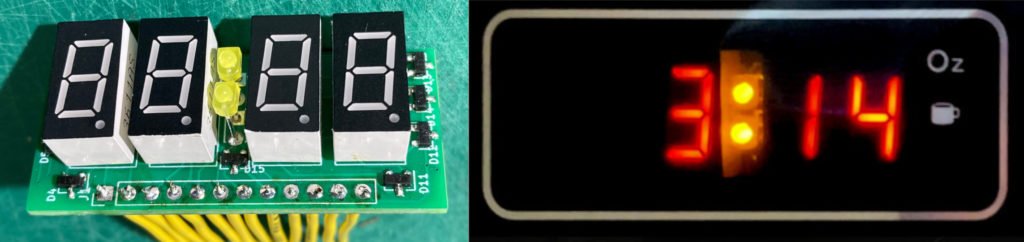 The display is a four-digit clock style (with a colon) LED seven-segment display, but the pin arrangement is so unusual that I was not able to find a replacement. The unusual arrangement probably comes from needing independent control over the two dots in the colon. The bottom dot is sometimes used as a decimal point, for example, showing 1.75/3.0/3.5 oz when “Popcorn” is pressed.