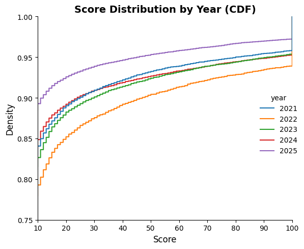 plt.title('Score Distribution by Year (CDF)', fontsize=14, fontweight='bold')