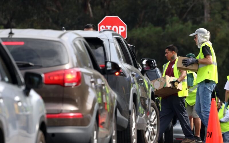 Houstonians line up in their cars for a special free food distribution by the Houston Food Bank at NRG Stadium in Houston, Texas, on November 1, 2025. Nearly one in eight Americans receive food stamp benefits from the U.S. government. Photography by Mark Felix/AFP/Getty Images