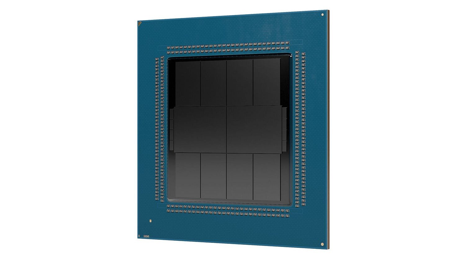 Calculating the die sizes of the base dies and the IO dies, the die size of the base die is approximately 747mm2 for each of the two base dies with the off-package IO dies each being approximately 220mm2. As for the compute dies, while the packaging precludes any visual demarcation of the different compute dies, it is likely that there are 8 compute dies with 4 compute dies on each base die. So while we can’t figure out the exact die size of the compute dies, the maximum size is approximately 180mm2. The compute chiplet is likely in the 140mm2 to 160mm2 region but that is a best guess that will have to wait to be confirmed.