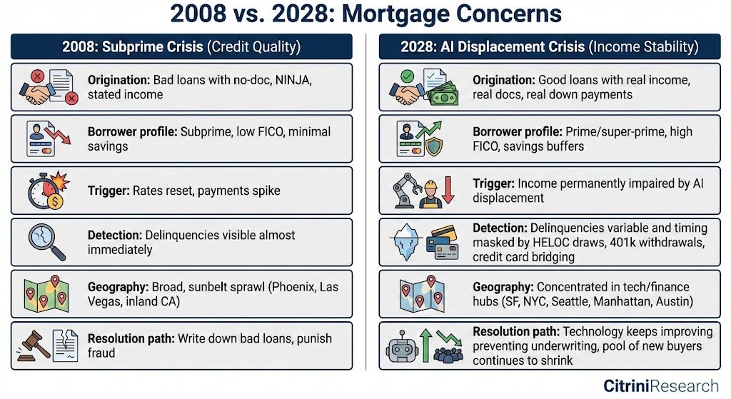 It was a negative feedback loop with no natural brake. The human intelligence displacement spiral. White-collar workers saw their earnings power (and, rationally, their spending) structurally impaired. Their incomes were the bedrock of the $13 trillion mortgage market – forcing underwriters to reassess whether prime mortgages are still money good.
