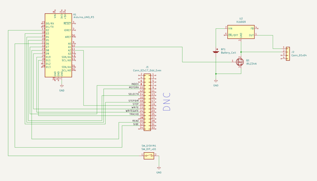 One crucial finding was that the ground side of the interface cable should absolutely not be connected to any grounds on the microcontroller side. I was using a relatively simple logic-level MOSFET, the IRLZ34N, to turn off the drive by disconnecting the ground side. If any ground is connected, the disk won’t turn off. But also: if any logic pin was being pulled to ground by the ATmega, that would also provide a path to ground. But since the ATmega cannot sink that much current this would lead to spurious resets! Obvious after the fact, but this took quite some headscratching. Setting all the logic pins to input, and thus high impedance, finally fixed the stability issues.