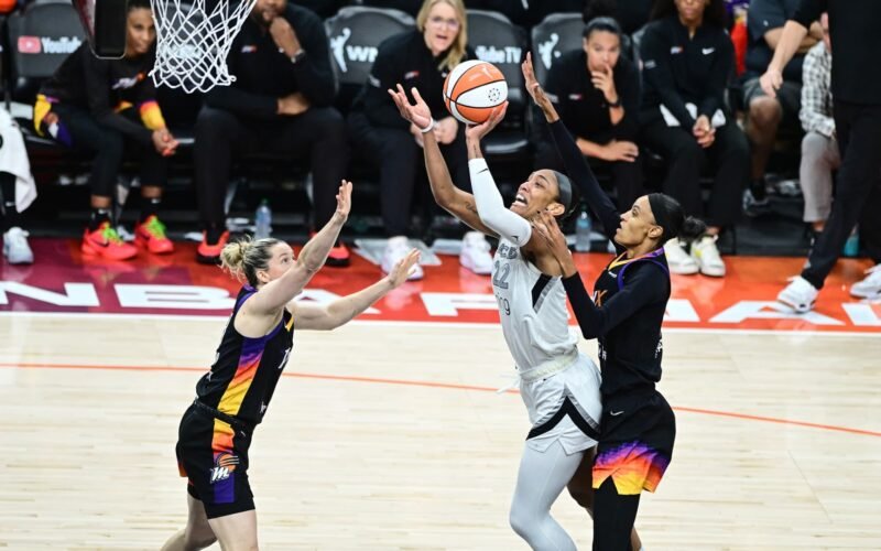 A’ja Wilson of the Las Vegas Ice drives the basket against the Phoenix Mercury during Game 4 of the 2025 WNBA Finals at PHX Arena in Phoenix, October 10, 2025.
