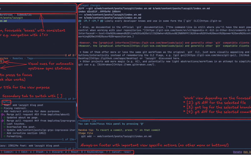 Personally, probably the best thing about the lazygit is its UX, notably how easy it is to use this tool, with just a basic understanding of the git CLI. Generally, it seems that a nice user experience is achieved due to deliberate choice of strong consistency, deliberate visualizations and interactive menus. Let me explain.
