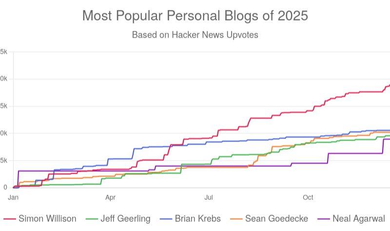With 2025 wrapped up, I can finally answer a question I’m curious about every year: who were the most popular bloggers of Hacker News?