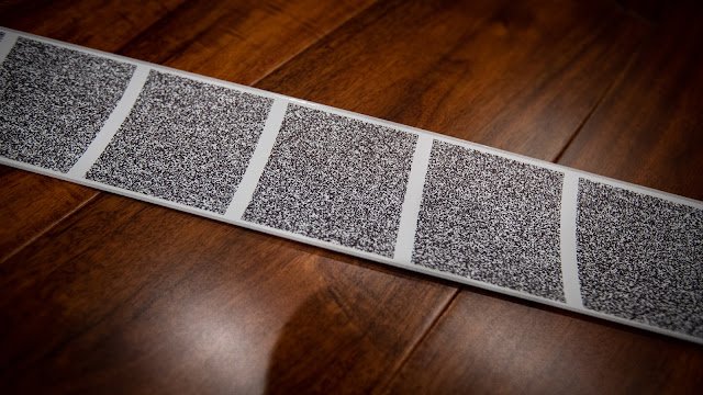 The tape passes through a box that provides a stage to flatten the tape, a light source and the camera. A small strip of paper flattens the tape as it enters the box and provides a source of tension to keep it flat. This job would typically be performed by a pinch-roller in a magnetic tape system.